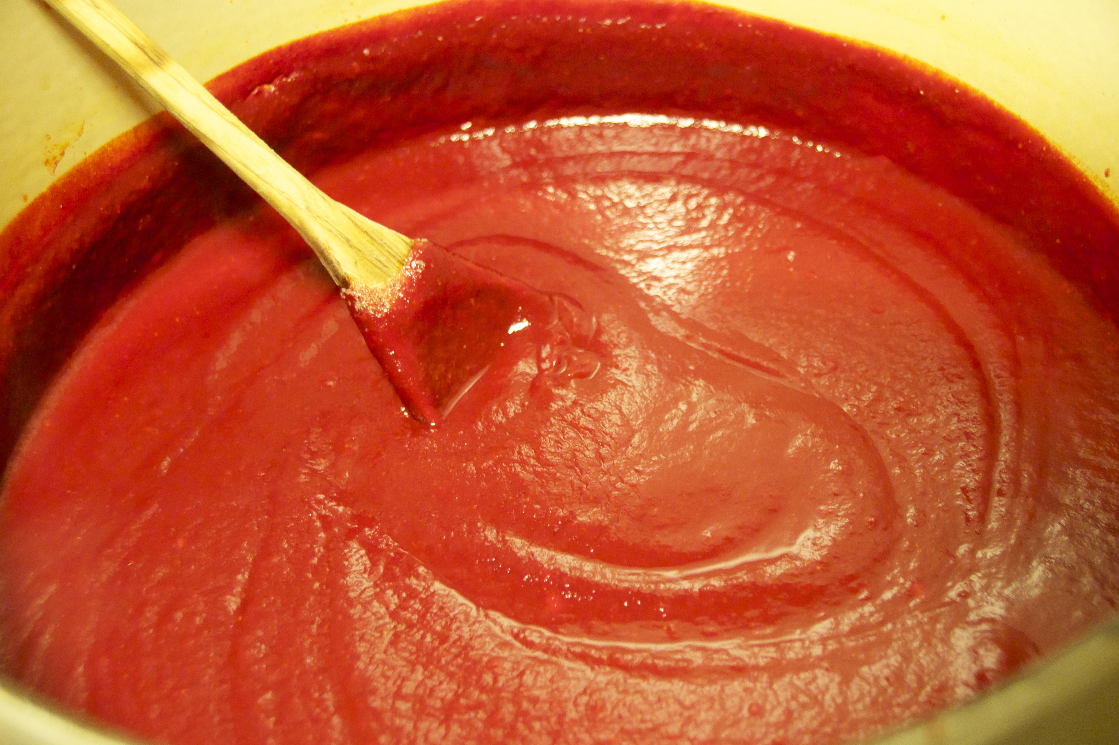 After blending, force the sauce through a sieve with a rubber spatula to remove any remaining skin and seeds. This is the time consuming part. This process will need to be repeated several times depending on the size of your sieve. Discard paste and seeds left behind and force the sauce through until you have a glistening red sauce. You may need to occasionally add water to help force the sauce through a sieve.