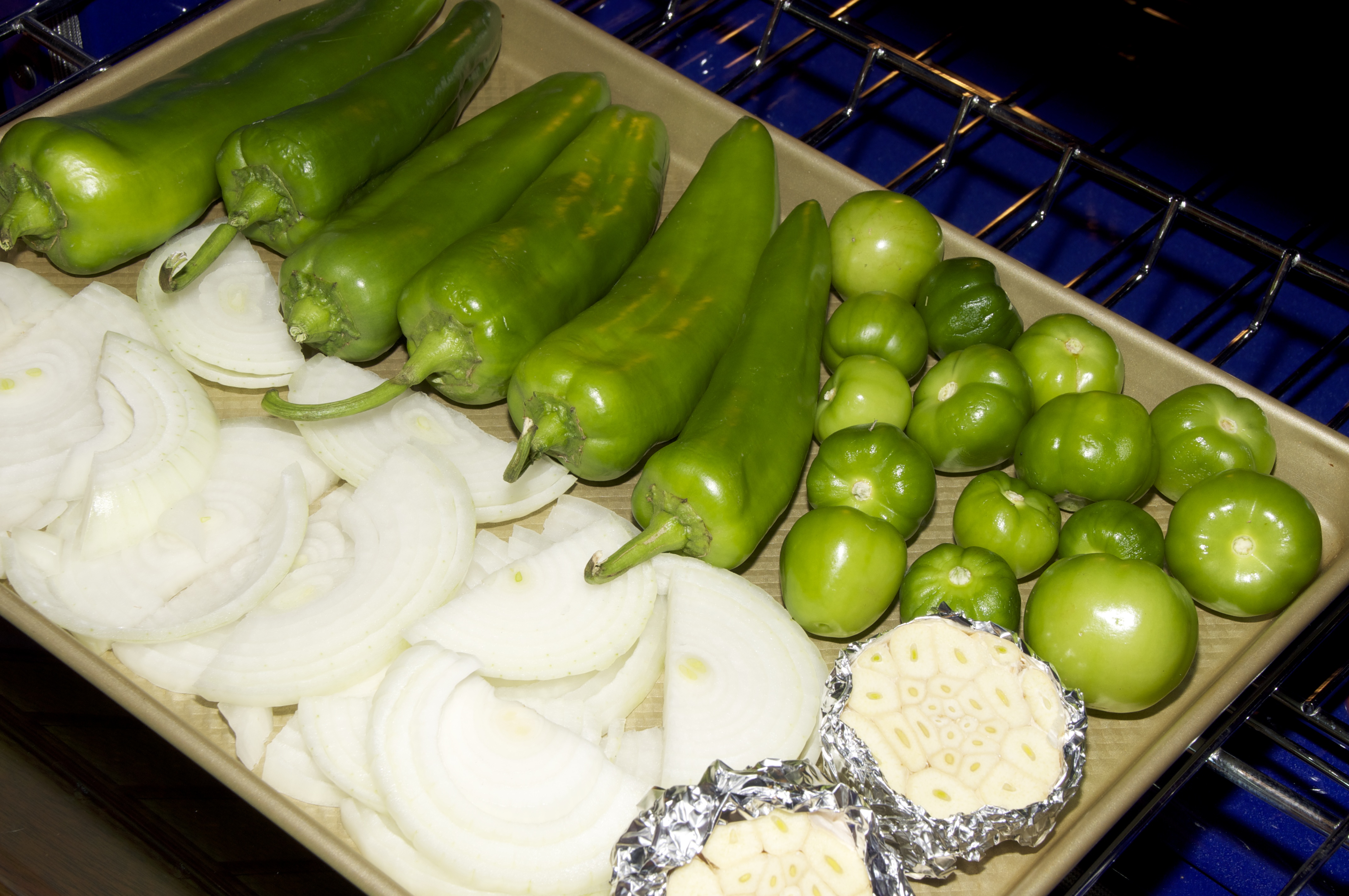 DSC_0008While the chicken stock is cooking, pre-heat oven to 400 degrees F.  Place Anahiem chile peppers, tomatillos, onions, and garlic on a cookie sheet.  The flesh of the garlic should be exposed and foil wrapped around the garlic shells to prevent burning.   Each of these vegetables finish roasting at different times.  The tomatillos will be done in 20 minutes.  The onions and garlic will finish in 40 minutes.  The anahiem chiles will be ready in 50 minutes.  When they are done roasting, place the tomatillos, onions, and garlic in a blender.  Place the roasted anahiem chiles in a sealed, gallon size, ziploc bag.  Allow the chiles to sweat in the ziploc bag for 20 minutes.  Remove the stems, skin, and seeds from the chiles.  Add the chiles to the same blender and blend all ingredients until smooth.