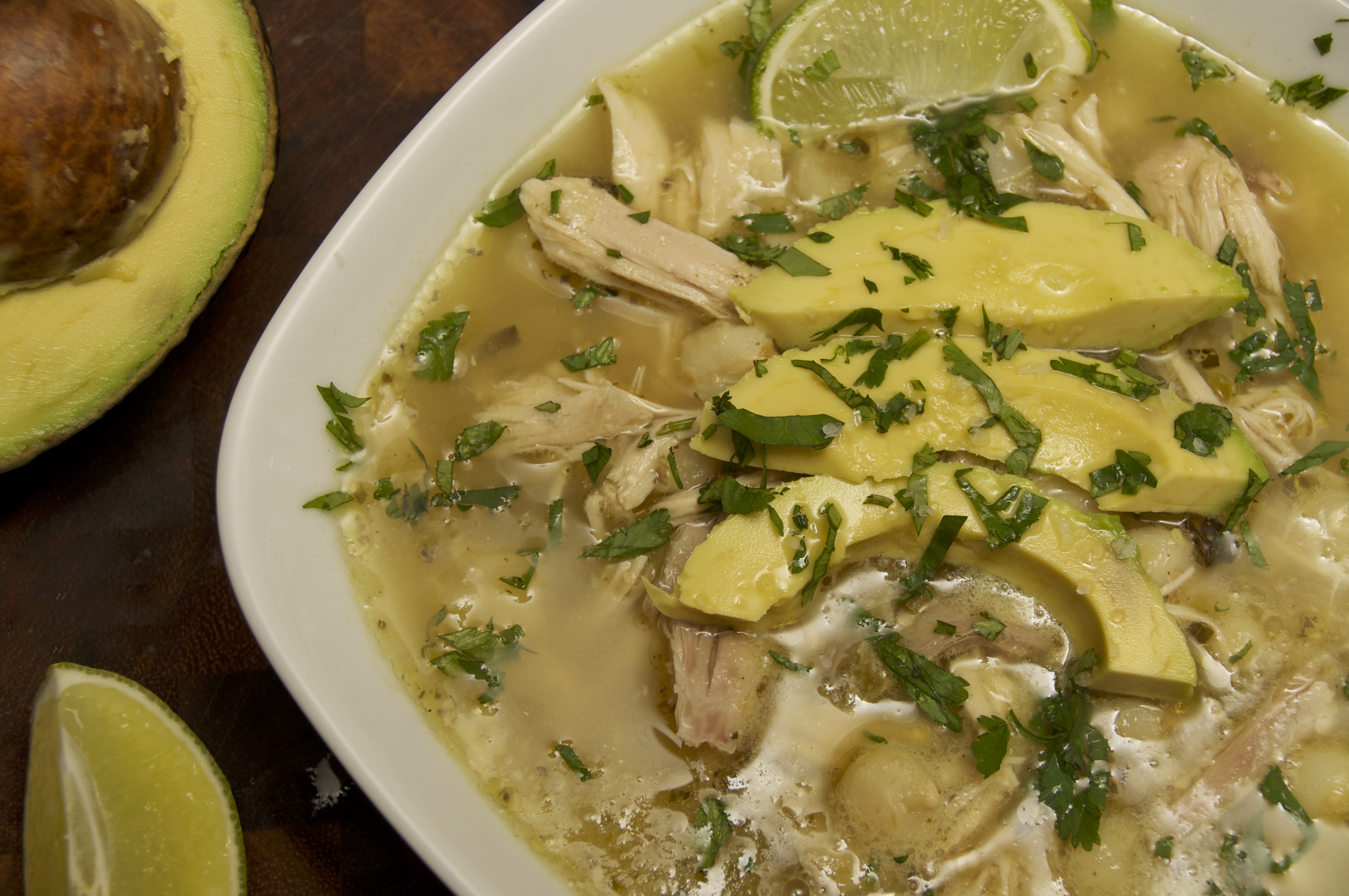Add the hominy, salsa verde into the chicken stock and shredded chicken.  Season the soup with cumin, oregano, and juice of one lime.  Simmer for 10 minutes and serve with fresh cilantro, salted avocado slices, and a lime wedge.