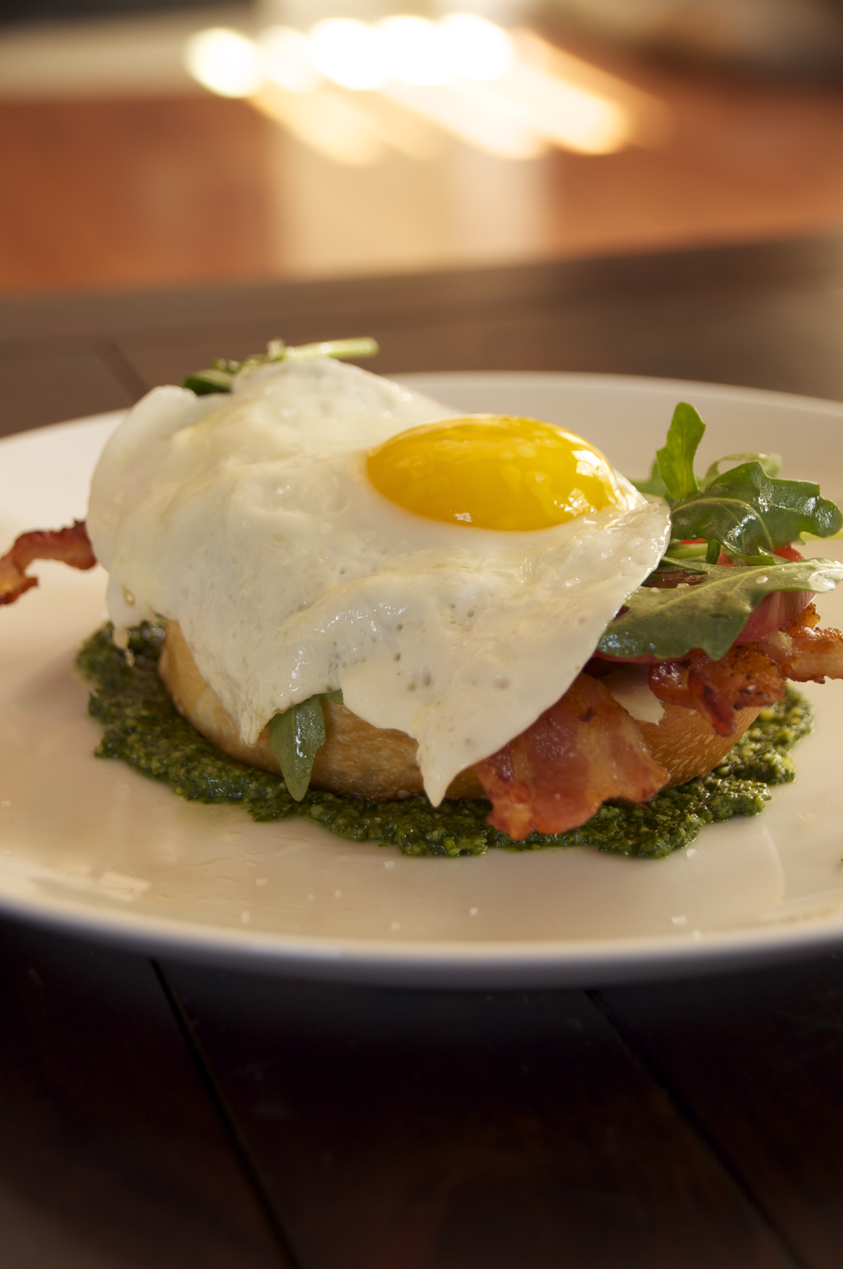 Slather the bottom of your plate with pesto. Place toasted bread on top. Then add manchego cheese, bacon, tomato slices, arugula, and egg. Finish with a pinch of sea salt or kosher salt on the egg. Enjoy!