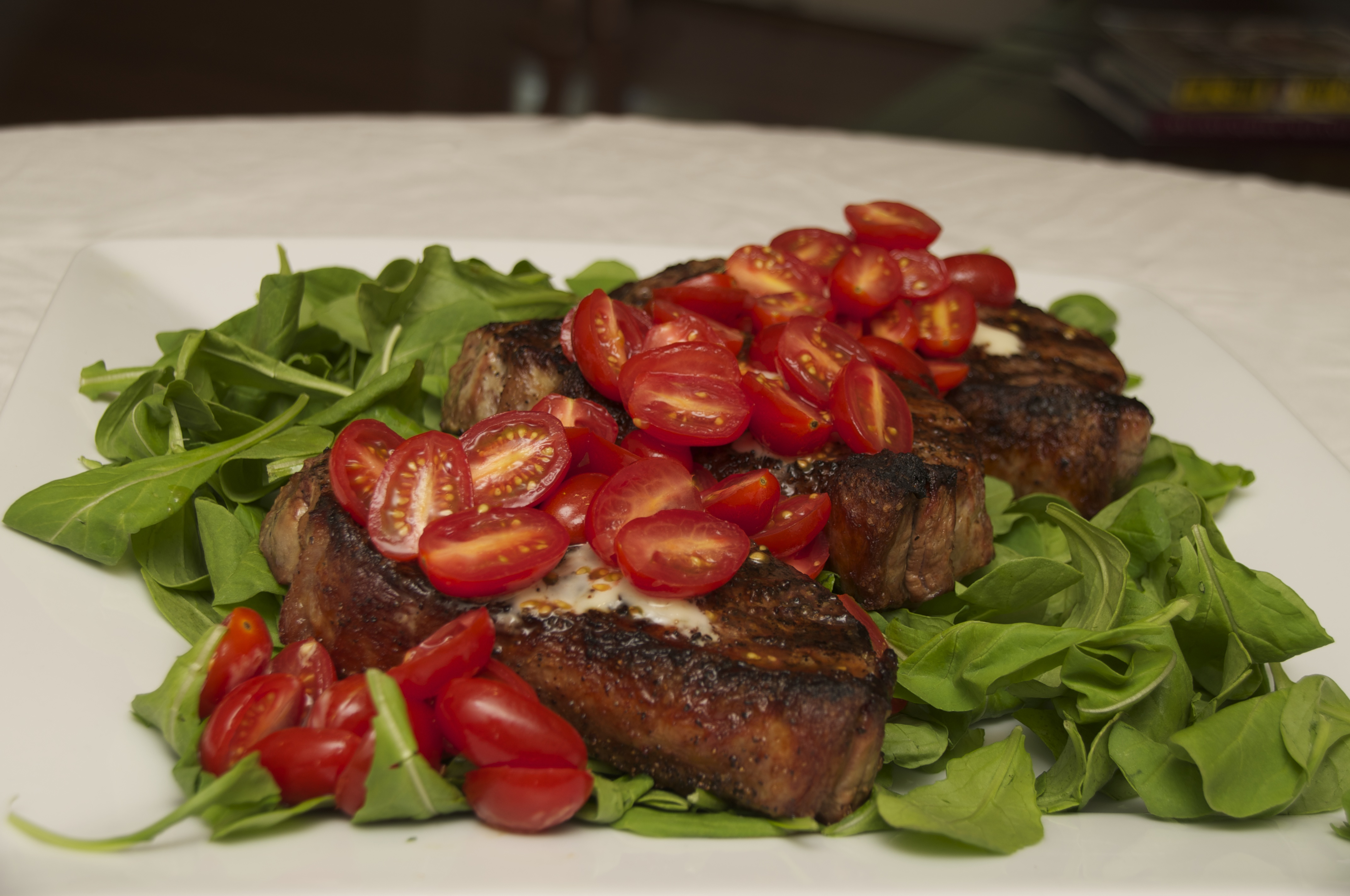 NEW YORK STRIP OVER ARUGULA AND GRAPE TOMATOES
