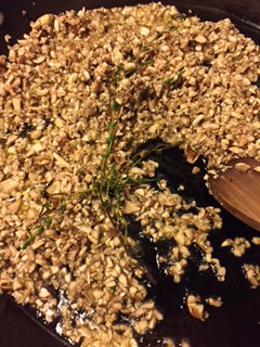 Pre-heat oven to 375 degrees. Chop entire pint of mushrooms into desirable bite size pieces. Add olive and tablespoon of butter to a large non-stick skillet on medium high heat. Once butter is melted add 2-3 springs of thyme and chopped mushroom. Sauté for 3-5 minutes until lightly browned. Add shallots and garlic and continue to sauté for 1-2 minutes.