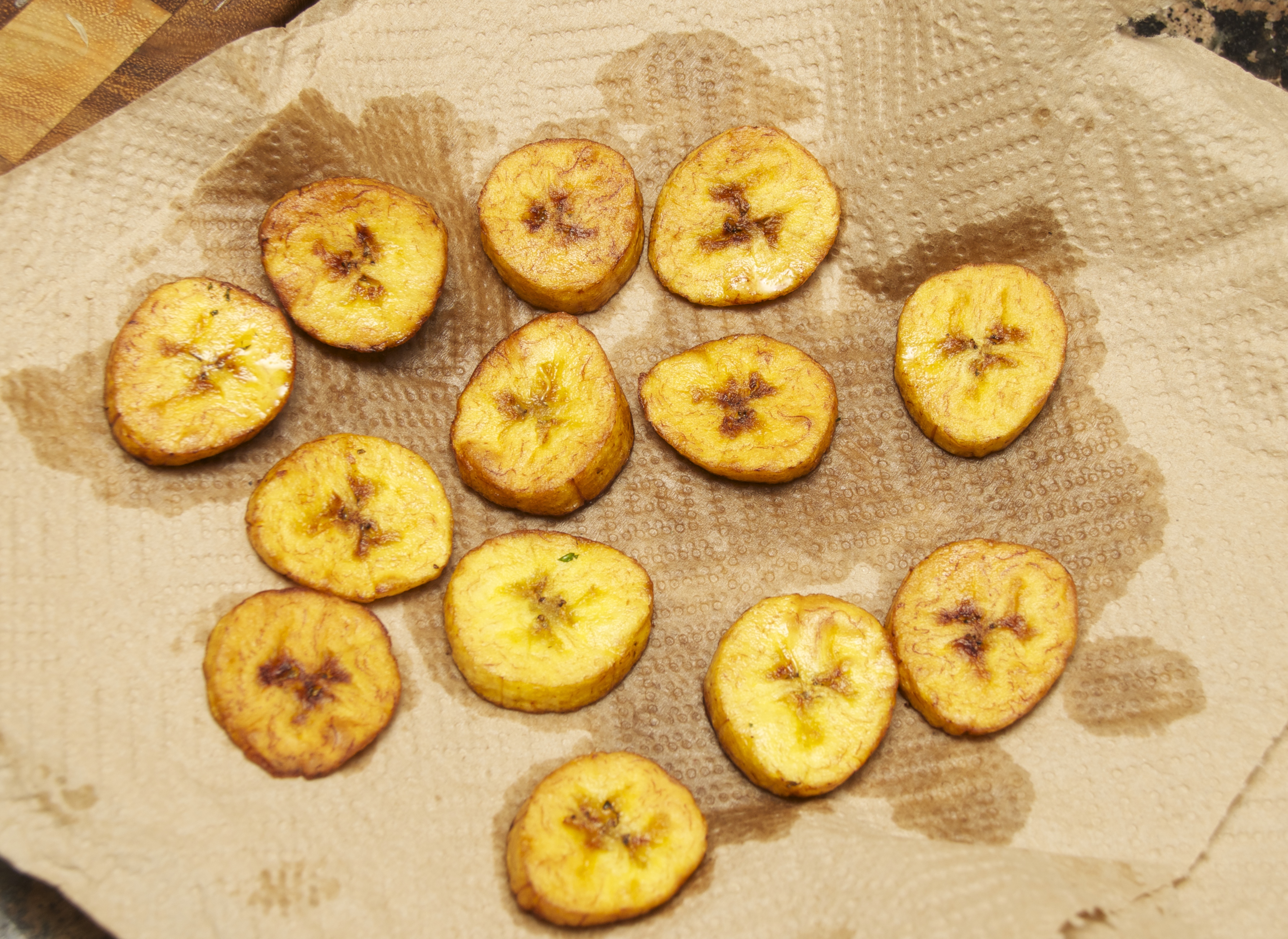 Place fried plantains on paper towel and lightly season with salt. Set aside until fish is ready.