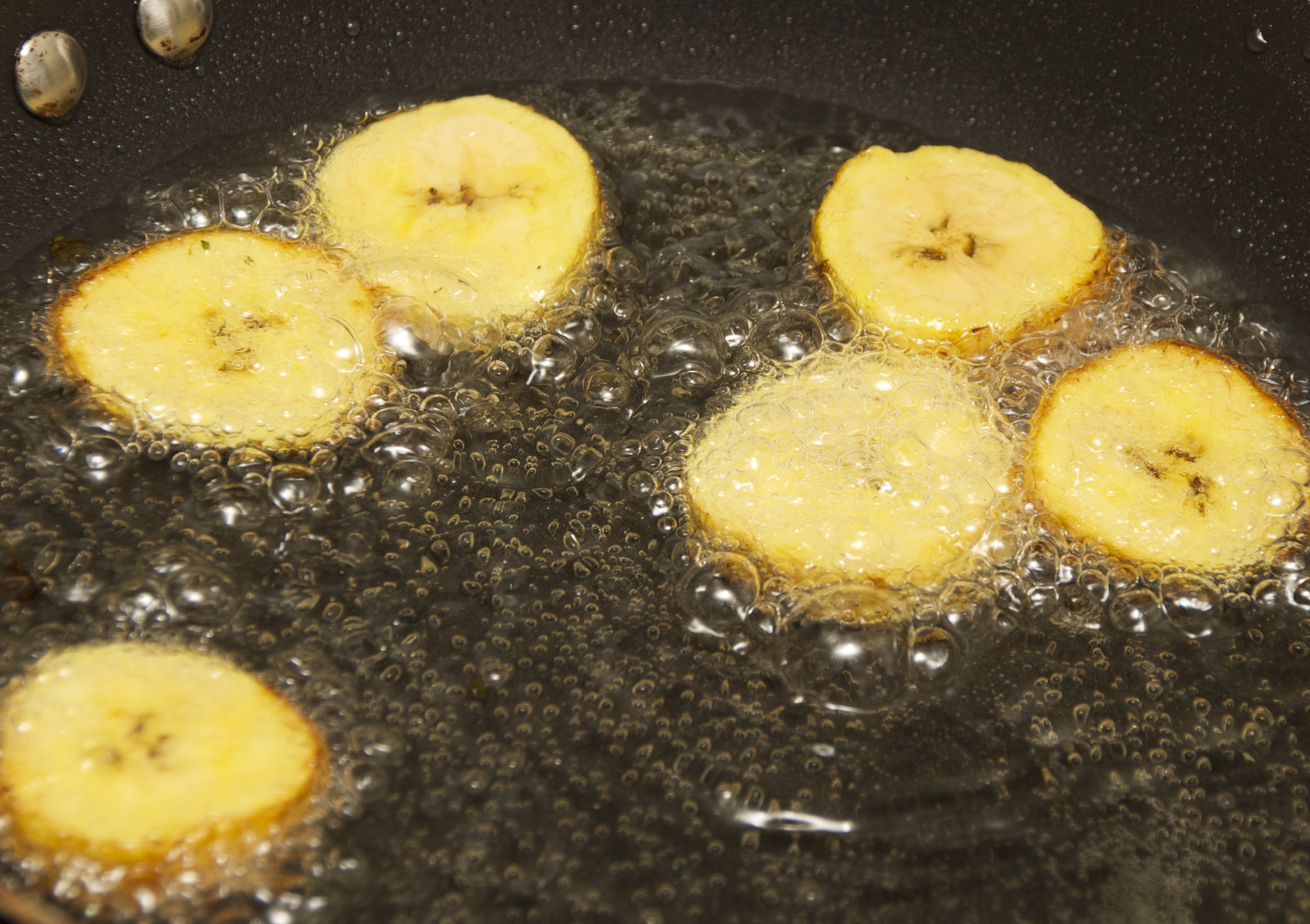 Carefully peel the plantain by chopping off the tips with a knife and scoring the skin along the length of the plantain. This will make peeling easier. Then simply pull off the skin. Chop into 1/2 inch thick rounds and fry on medium high heat until golden brown on both sides.  Your oil will go farther if you use a small skillet.  If using larger skillet you may need more oil.
