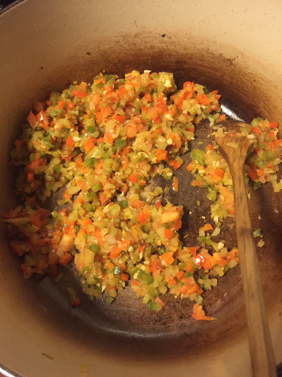 Add oil to large pot on medium high heat and sauté onions, red and green peppers,  and celery until softened not browned.