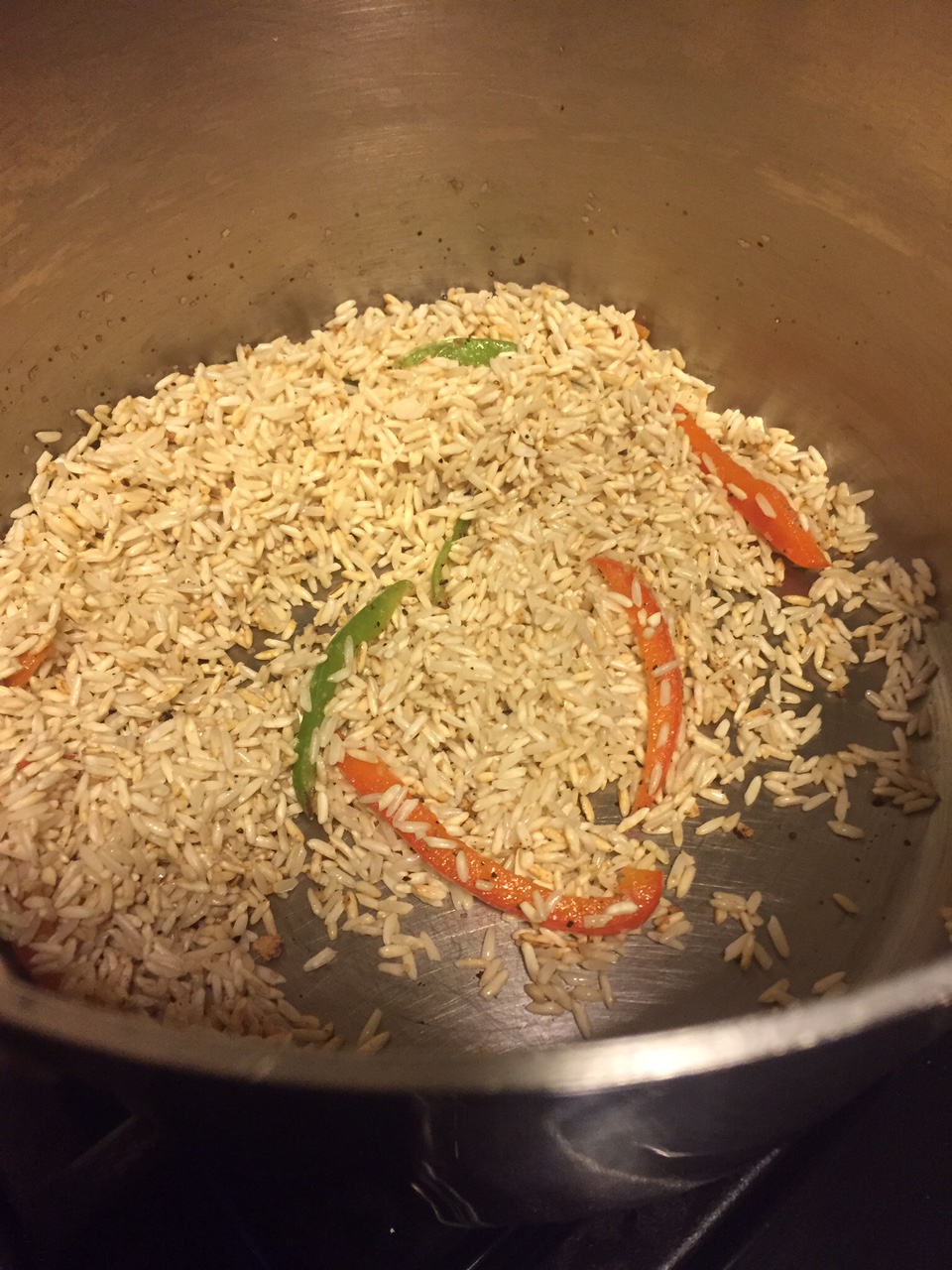 Start your rice when the beans have been on the stove for at least ninety minutes.  Add oil to rice pot on medium heat then add rice and pepper strips.