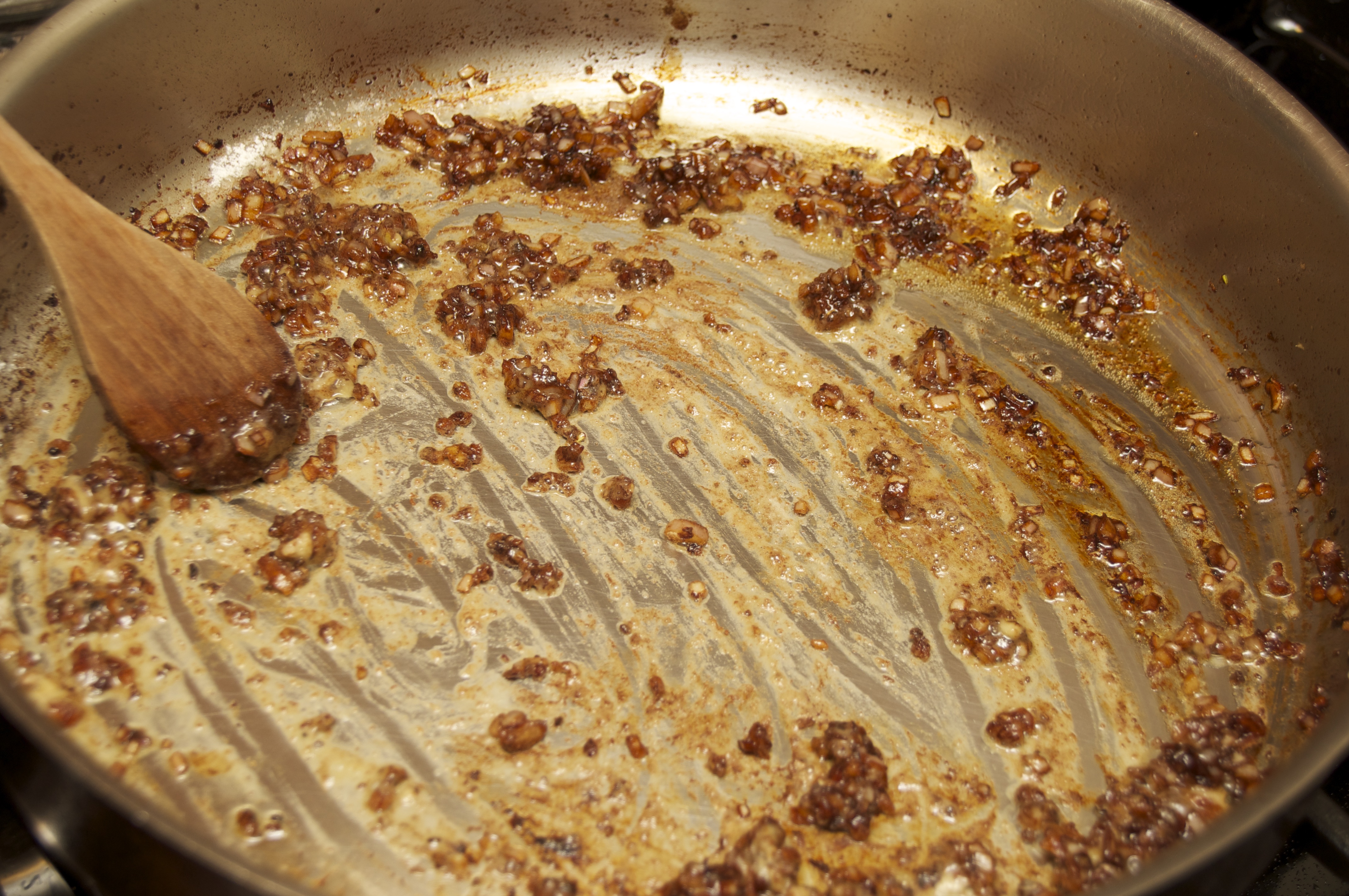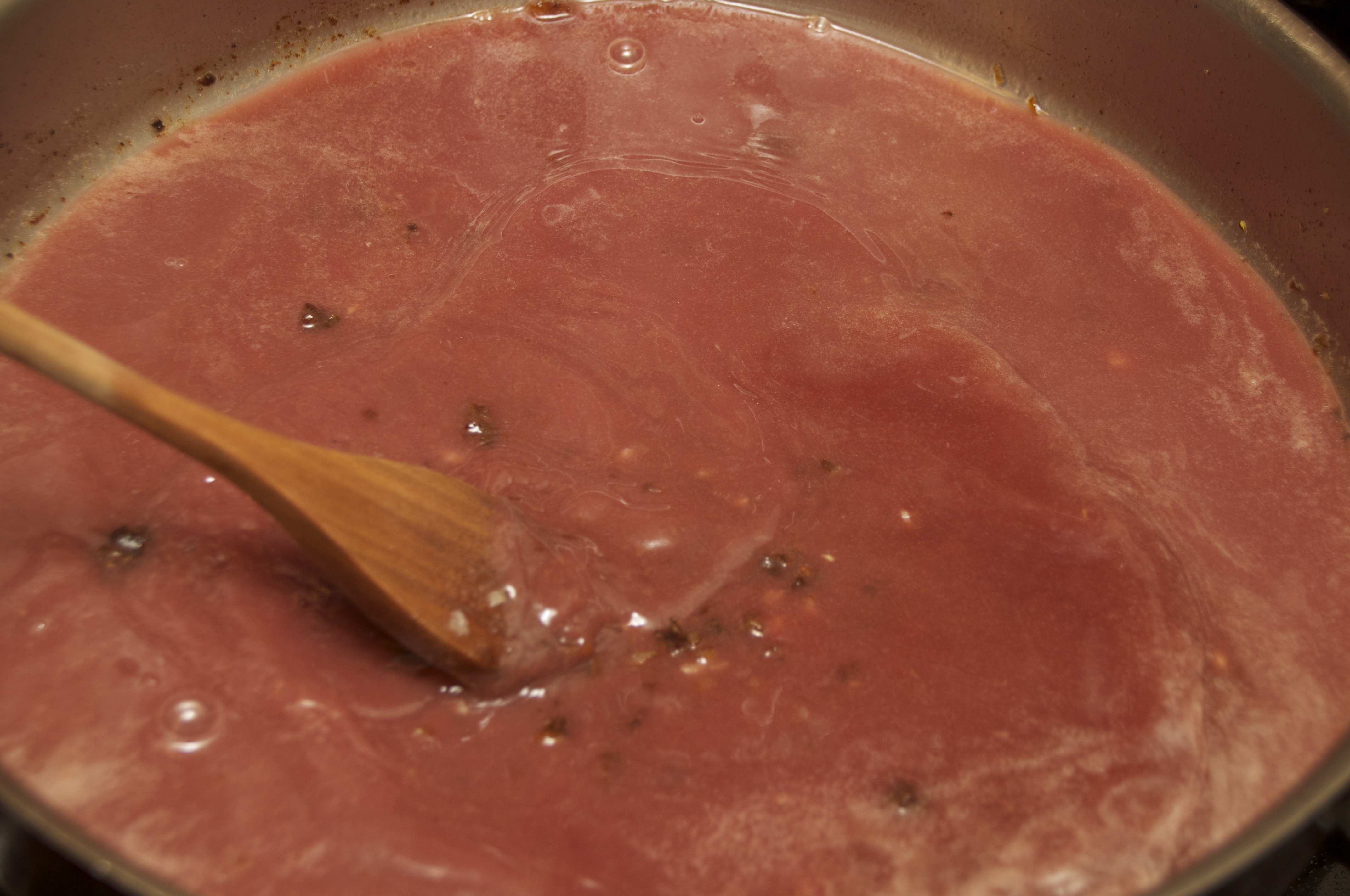 Turn burner on high and reduce for 5-10 minutes until red wine reduction is slightly thickened.  While sauce is reducing scrape the pan drippings from the bottom of the pan.  Taste for seasoning.  You may need to add a pinch of salt or sugar, depending on the wine you use.