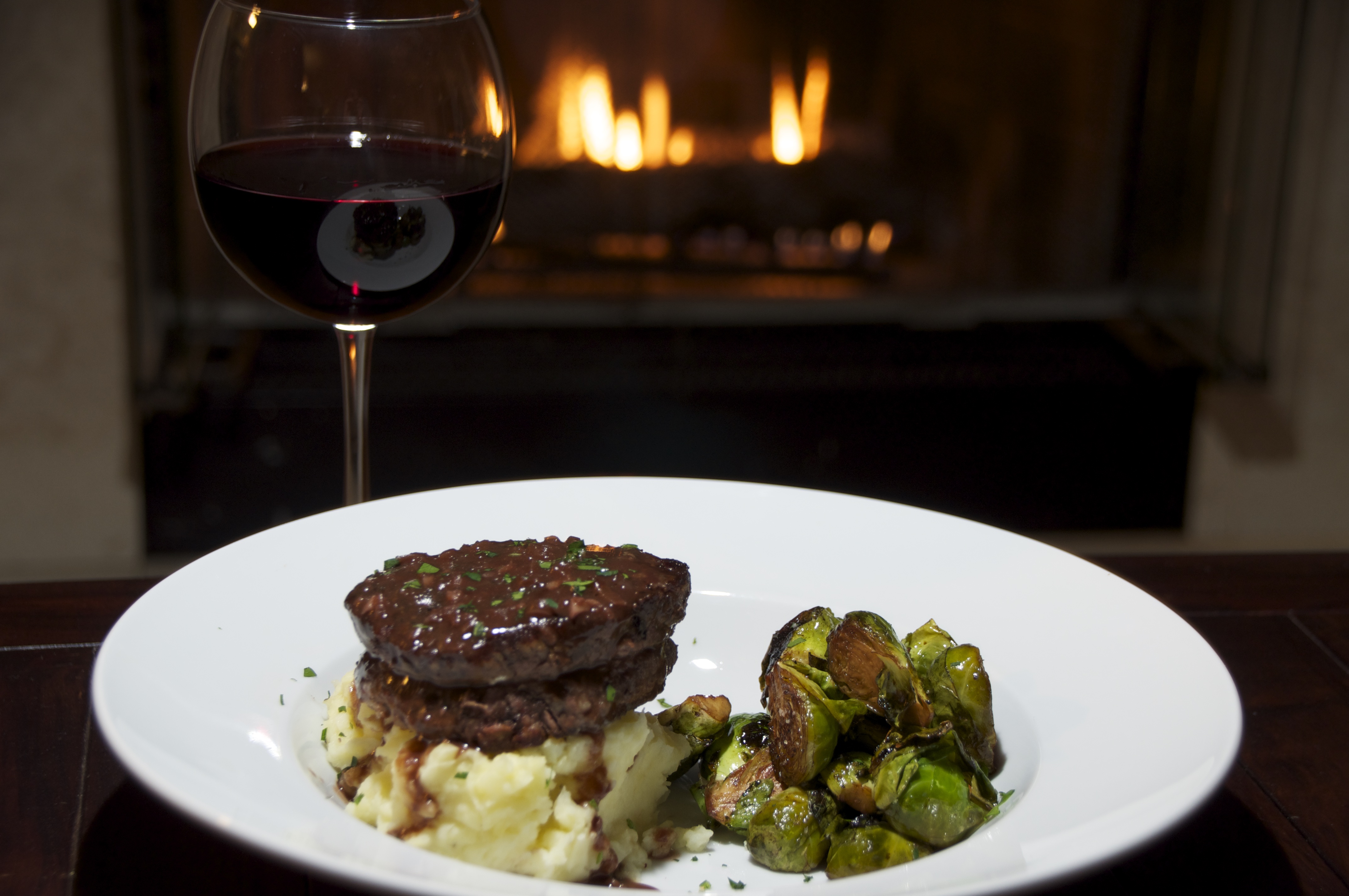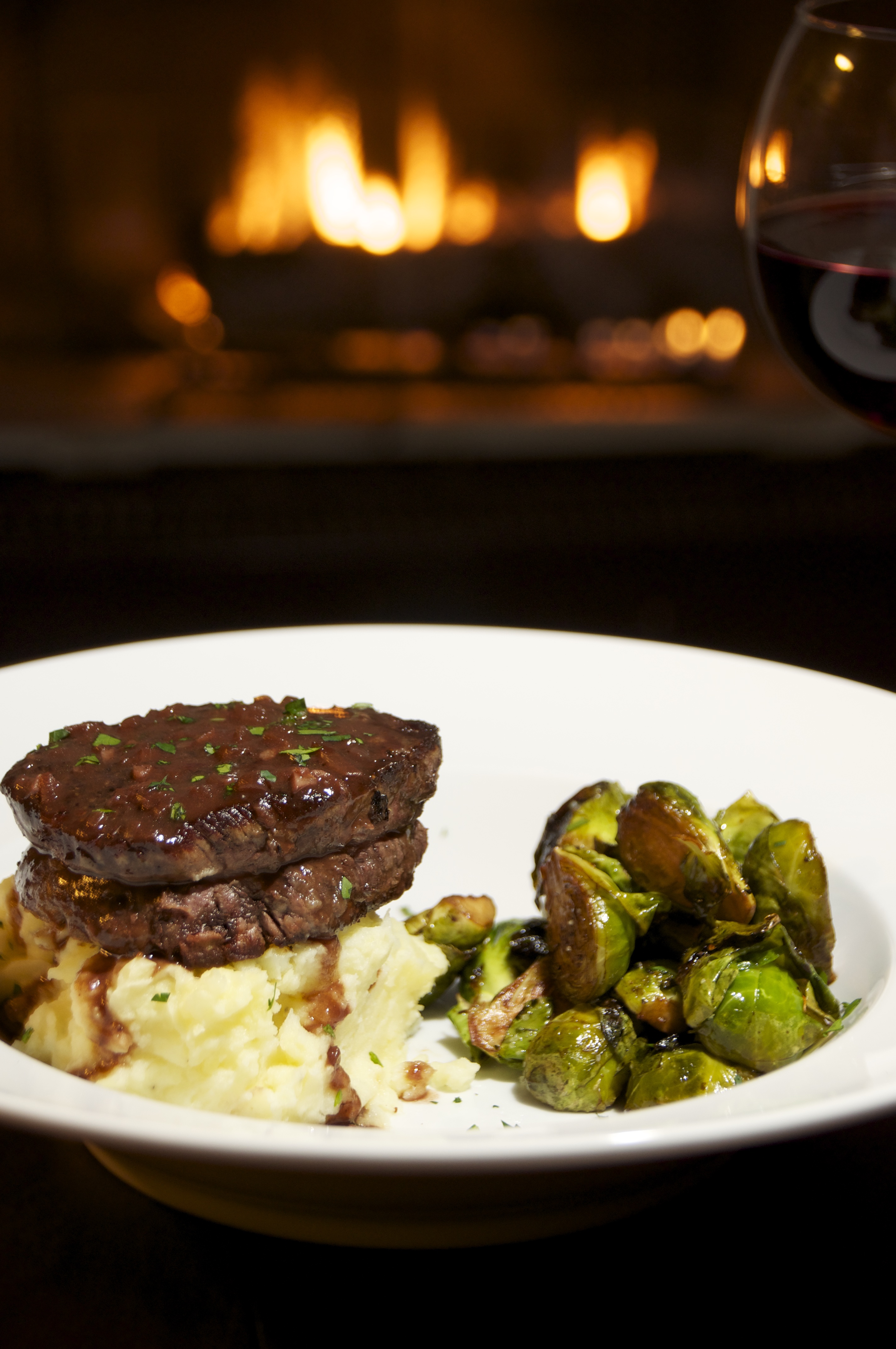 Remove twine from Filet mignon.  Start with the mashed potatoes on plate and add filet on top.   Drizzle reduction over filet and mashed potatoes.  Add brussel sprouts and finish with chopped parsley if your feeling fancy.