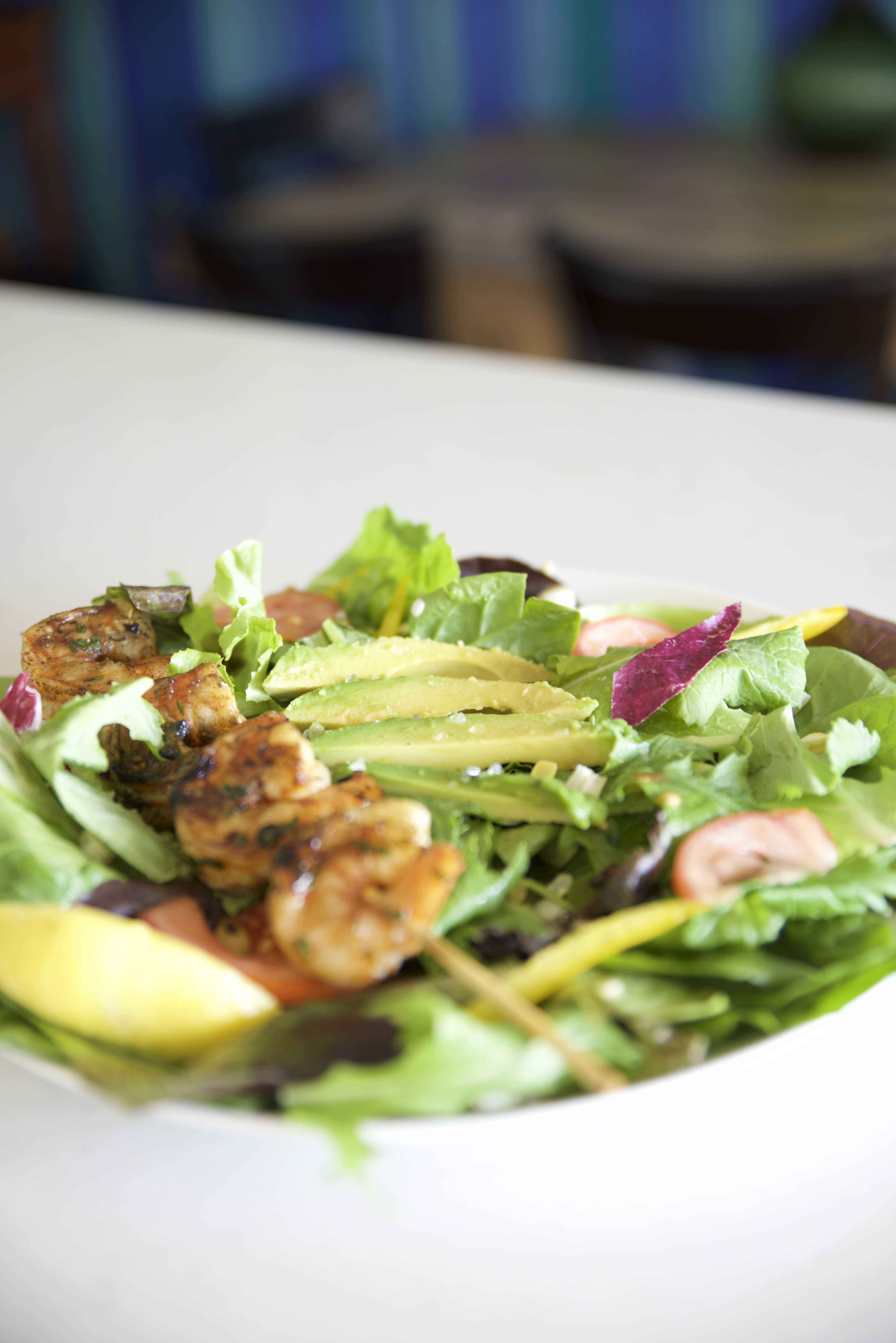 Take the charred corn and shave all the kernels off the sides to add to salad. Assemble the salad with all it’s ingredients then add shrimp skewer on top. Drizzle vinaigrette on salad and enjoy. Garnish with lemon wedge.