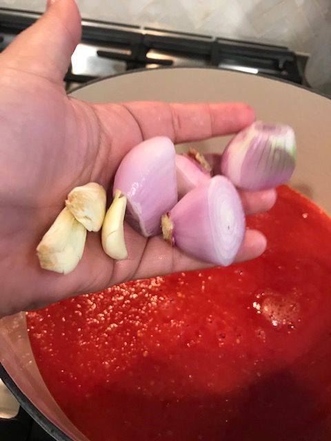 Blend whole peeled tomatoes until desired consistency.  Add tomatoes to sauce pot and add shallots, garlic, basil, thyme and salt.  Bring to a low boil and add lid then bring down to a low simmer.  Simmer for 40 minutes with lid on then take lid off for last 20 minutes for a thicker sauce.  The Chef in Rome said, “You Americans like chopped onions and garlic in your sauce.”  The Italians like the flavor the onions and garlic impart but don’t like it in the sauce.  They leave things almost whole so they can fish them out when the sauce is ready.  It’s easier to make and actually tastes better.  Life changing!