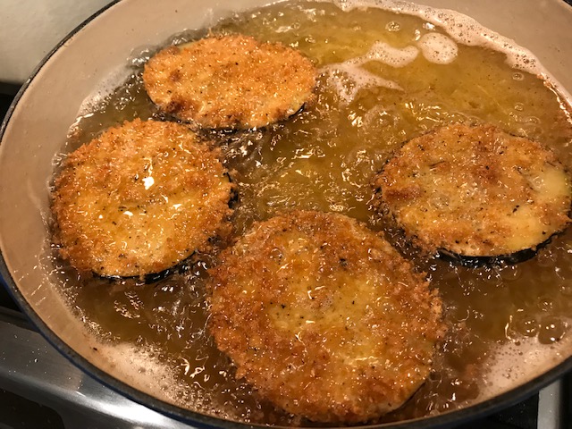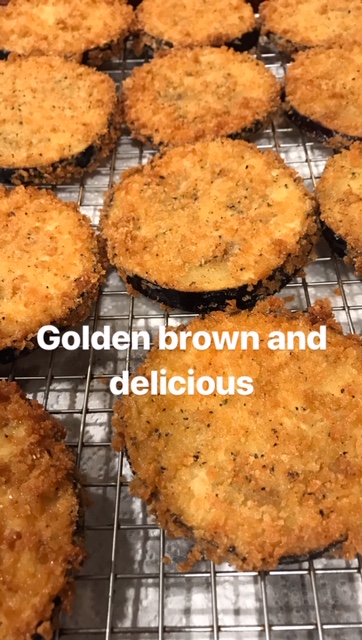 When oil is between 350-365 degrees gently add breaded eggplant into olive oil and fry until golden brown on both sides.  Set eggplant on a raised metal rack so eggplant doesn’t sit in oil.