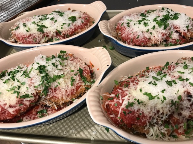 Pre-heat oven to 4oo degrees.  Place olive oil in pot and bring to 350-365 degrees.  Slice eggplant into 16 slices with skin on.  Prepare breading station by placing the flour in a platter with 1/2 tsp of salt.  The 5 eggs should be mixed and in its own platter.  The breadcrumbs in it’s own platter with 1/2 tsp of salt and some parmigiano-reggiano cheese.