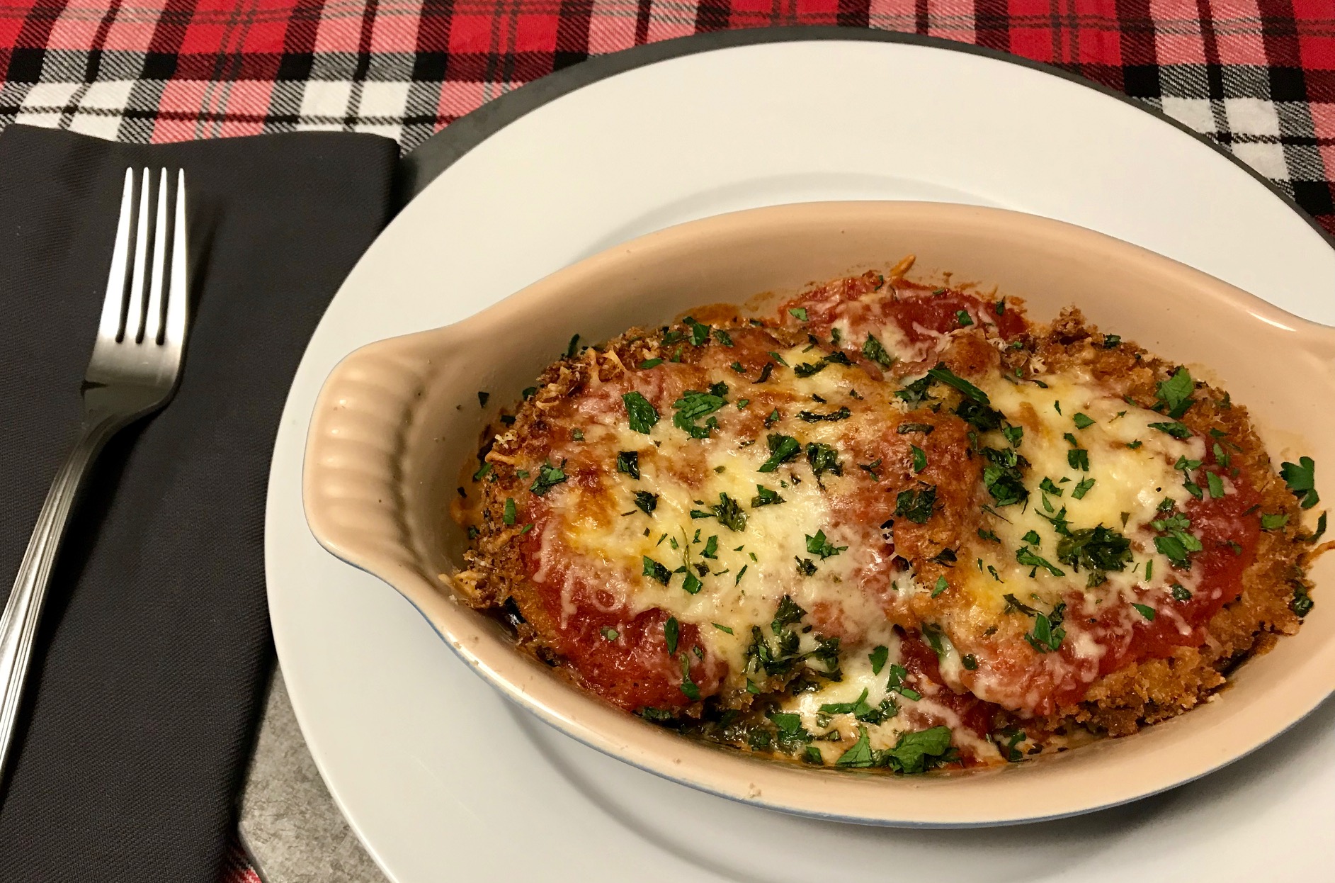 I like to assemble the eggplant layered like a lasagna in its own dish.  Start with sauce then eggplant, mozzarella cheese, parmigiana-reggiano cheese and repeat.  The last layer add some fresh parsley and bake for 20 to 25 minutes until cheese is melted and bubbling.
